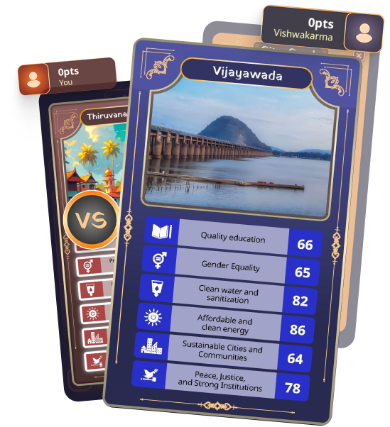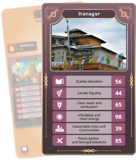 "The SDG Urban Index & Dashboard 2021-22, developed by NITI Aayog, is a tool for monitoring the progress of Indian cities across key Sustainable Development Goals (SDGs). The index tracks 77 indicators from 15 SDGs, including health, education, clean energy, poverty reduction, and infrastructure. This index helps strengthen data-driven decision-making, ensuring cities move towards a sustainable and prosperous future. Playing City Quest helps spread awareness of these goals and highlights how urban areas contribute to India’s development.